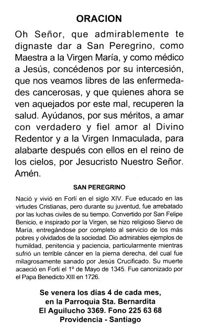 Nuestra comunidad, admira y celebra la figura de San Peregrino, resaltando su aporte a la Orden Siervos de María, lealtad y compromiso con el evangelio, por el milagro que Jesús hizo en él, se convirtió en patrono de los afectados por el cáncer.